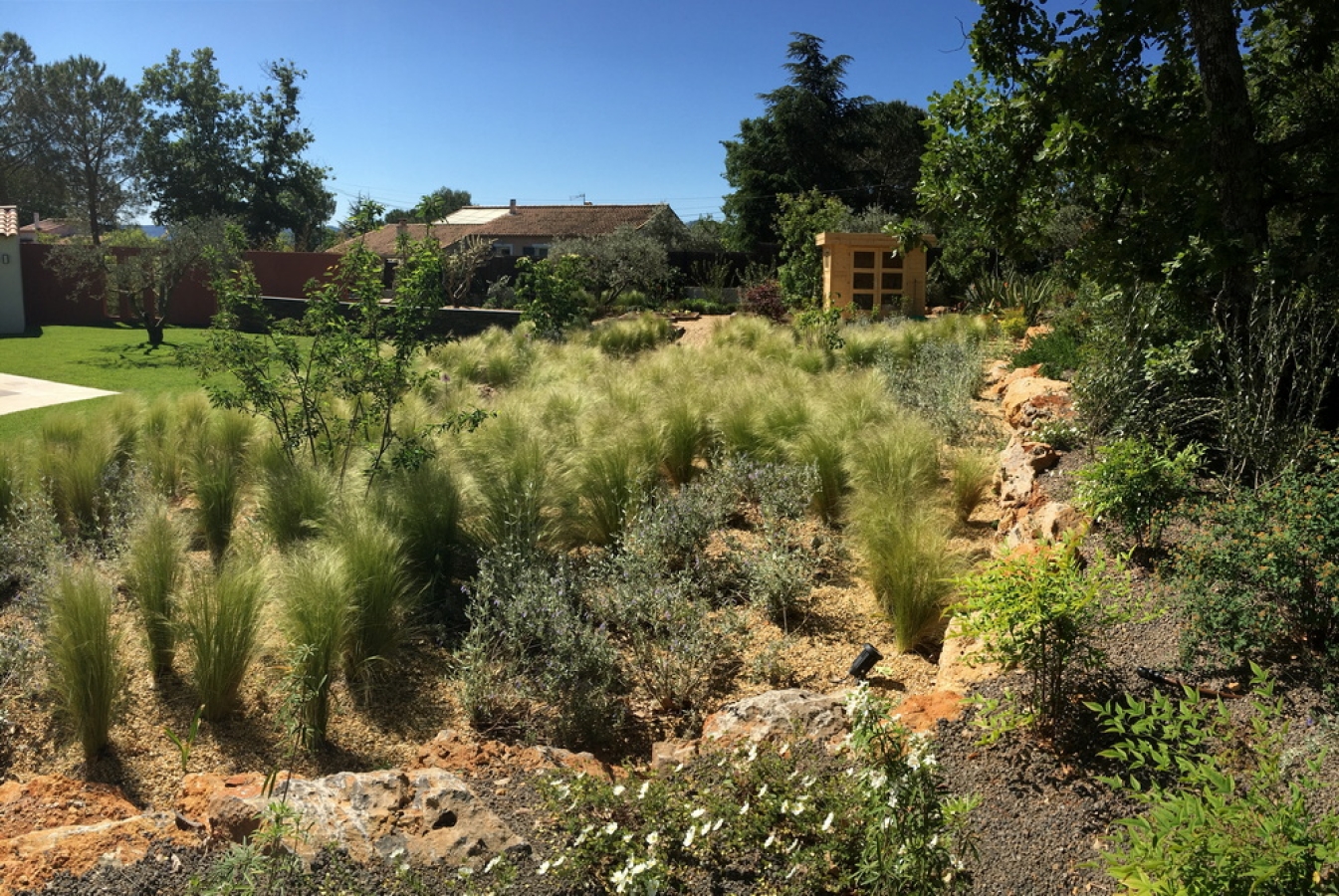 Ce jardin naturel met en scène et articule différents espaces de vie : piscine aux lignes contemporaines, plage et terrasse, vaste pelouse, boulodrome, potager, etc.