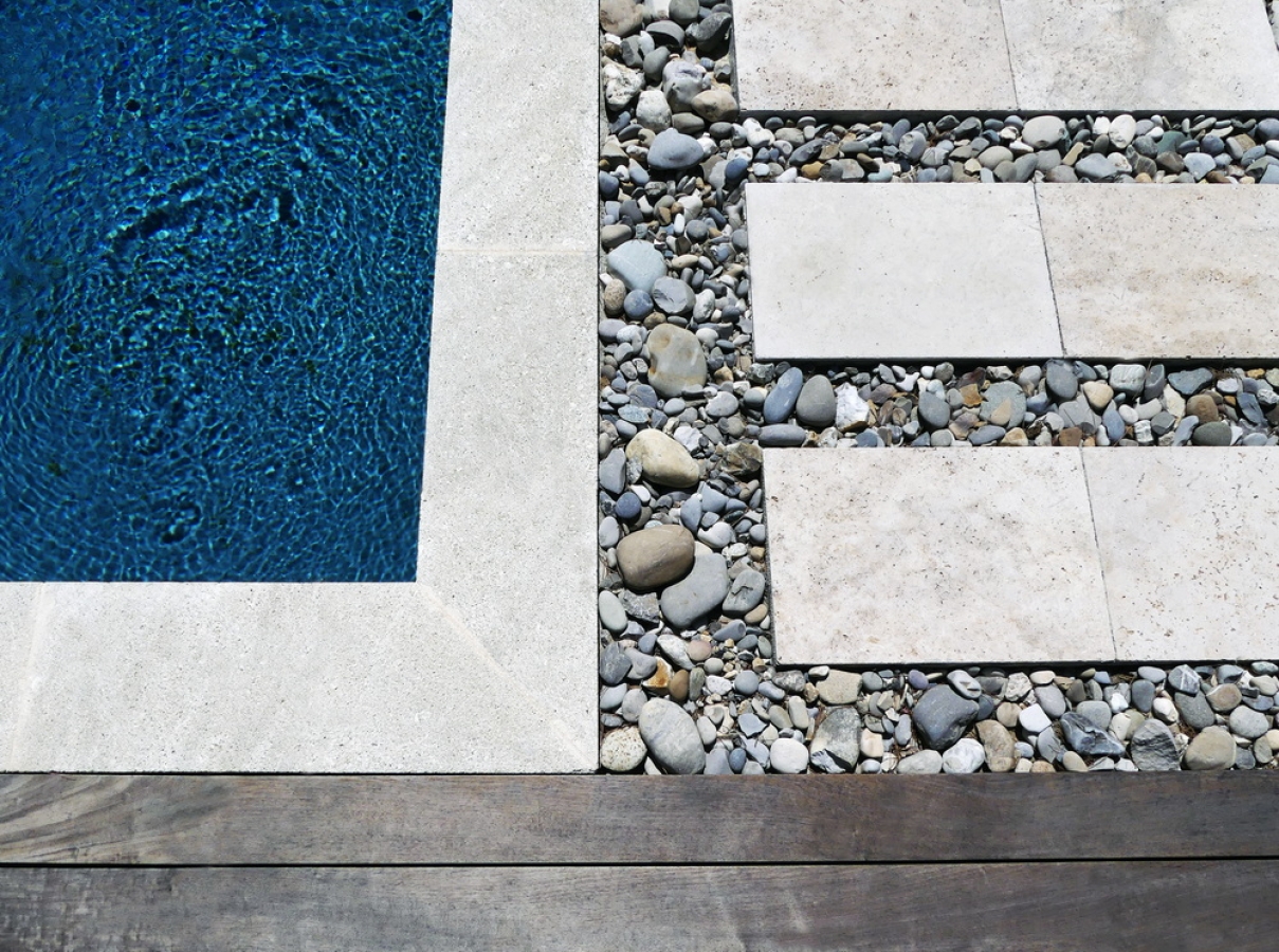 Afin de créer des espaces de détente et de cheminement sur ce terrain très en pente, j’ai proposé la création d’un jeu de restanques en pierres, dont l’effet graphique est accentué par la plantation de massifs naturalistes en surplomb de chaque muret. Certaines de ces restanques sont engazonnées, alors que d’autres sont l’objet de plantations denses. La piscine existante a été intégrée à l’une de ces restanques et ses abords ont été relookés, avec de vastes terrasses très conviviales, en travertin et en bois exotique.